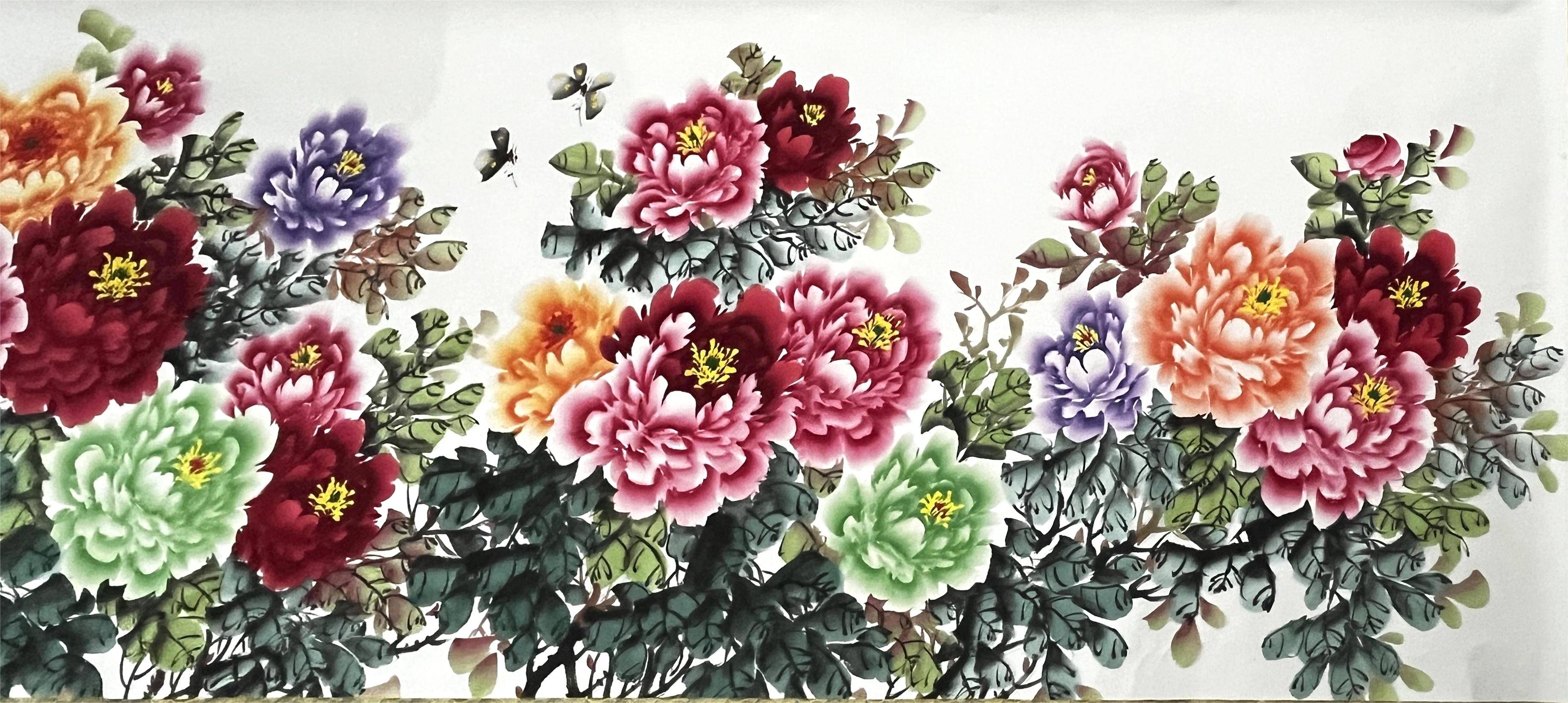 谈及工艺匠心,这幅《花开富贵图》堪称当代工兼写花鸟画的巅峰之作,每一处细节都彰显着“慢工出细活”的传世匠心。创作之初,张广恩先生甄选安徽泾县特级宣纸,质地绵密柔韧,吸墨性极佳,为笔墨流转提供了绝佳载体;颜料选用纯天然矿物颜料与植物颜料,朱砂、胭脂、藤黄等色彩层层晕染,历经岁月沉淀不褪色、不暗沉,色泽愈发温润华贵,这正是传统古法工艺的精髓所在,也是当代机器印刷品无法企及的质感。画面中,牡丹或怒放倾城,或含苞待放,花瓣层叠细腻,以工笔技法勾勒轮廓,线条流畅如行云流水,花瓣的肌理、脉络清晰可见,仿佛触之可及;枝叶以写意笔法挥写,墨色浓淡相宜,枯荣相生,既有工笔的精致,又有写意的洒脱,虚实相生间尽显“国色天香”的雍容气度。更难得的是,每一幅作品均为张广恩先生亲笔手绘,无任何代笔、复刻,每一笔、每一划都凝聚着其艺术心血,每一幅都独一无二,这正是“孤品”的核心价值所在,也是历史制造工艺传承至今的初心坚守。